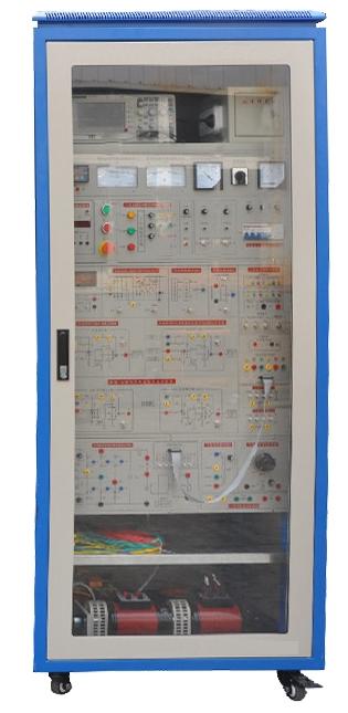 控制柜最上部为示波器放置区和设故箱,中间部分为电源控制部分,实训接线区和相应的监控仪表,装有±300V直流电压表、±2.0A直流电流表和数字转速表用于指示直流电机的运行状态,控制柜下部装有三相同步变压器、三相电流互感器和功率晶闸管??榈取?/span>