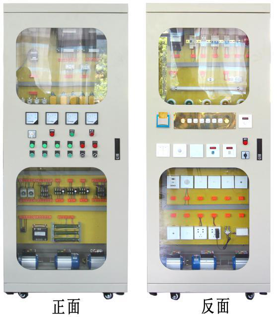 1、本装置采用正反二面开门的离墙式威图电气控制柜,且正反面同时都可以操作,柜体中宽度能保证两个学生同时合作接线实训的需要,其外形尺寸宽×厚×高分别为:800×600×2000 mm。柜体采用厚度为国标1.5以上的优质钢板,柜门采用厚度为国标2.0以上的优质钢板并安装四块大的玻璃,学生能通过玻璃看清柜内各元器件及相应的动作,金属表面喷塑,柜体中间有二块优质环氧树脂绝缘板和相应的支架系统隔离正反两个柜体,安装板上安装智能建筑电气控制线路各实训考核??椤8髟骷械慕酉叨硕剂又料嘤Φ淖ㄓ檬笛到酉叨俗由?,每个接线端上都套有用电脑打印接线端名称及编号的套管,并且更换方便。被控制电机安装于电气控制柜内。