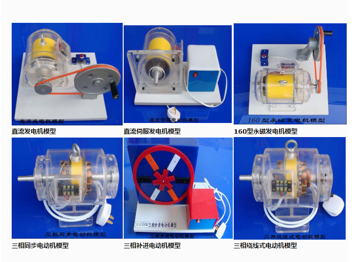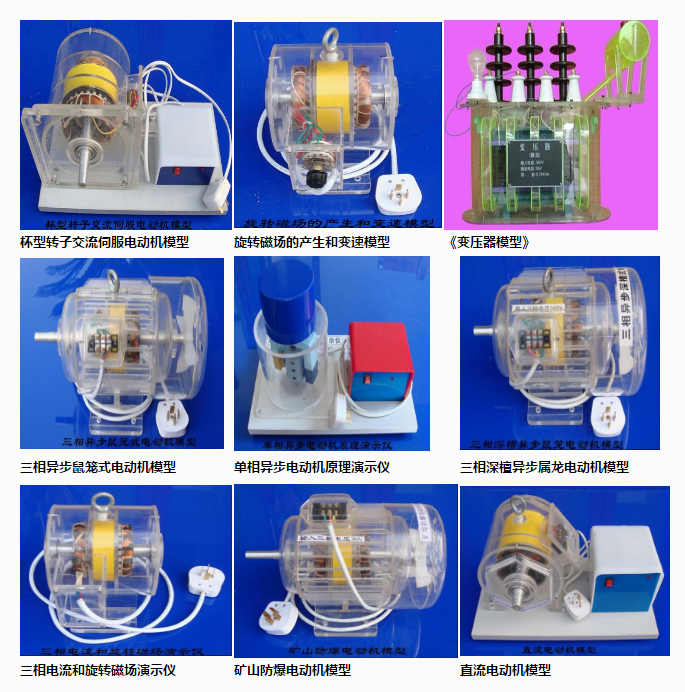 透明电机教学演示模型,是传统教具产品,在多年生产基础上不断改进探索,并参考国外先进工艺技术,采用高精度加工工艺克服了透明有机玻璃具有热塑性、容易变形及机械强度差的特点,全部实现了模具加工、一次成型。使整台模型透明直观、玲珑精致、形象逼真,并且能够通电转动演示。重点突出了“透明、演示”这一特殊的教学要求。在设计产品的同时,上海戴育注重以理论为依据,以演示为目的。系列电机与变压器模型外形,采用实物同等形状,多种有机彩色配套,内部结构均按有关电机原理制作,极力追求模型的层次性、透视性,正确反映教学原理,力求达到更好的教学目的和效果。