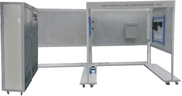 多功能配线培训装置柜体分为上中下三部分。柜体上部为低压配电屏,可以进行低压配电柜一次设备安装配线和剩余电流?;て鞯陌沧芭湎撸饕考械缪?、电流指示仪表和刀开关、按钮开关指示灯等组成。中部为多功能网孔板,便于各种电气元件的安装,可安装正反面网孔板,便于安装仪表、动力及照明设备的安装配线。下部可以放置电机等设备。用于培训学员学习各种低压设备安装及配线工艺。