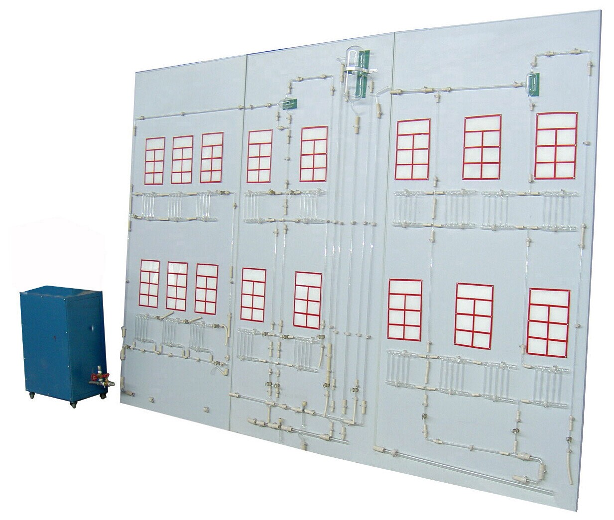 模拟采暖散热器片、采暖供水干支管道、回水干支管道、集气罐、高位膨胀水箱、溢水管、信号管、循环管、排水管、膨胀管、模拟房间墙面、模拟供暖锅炉、供水泵、供水箱、实验台框架等。