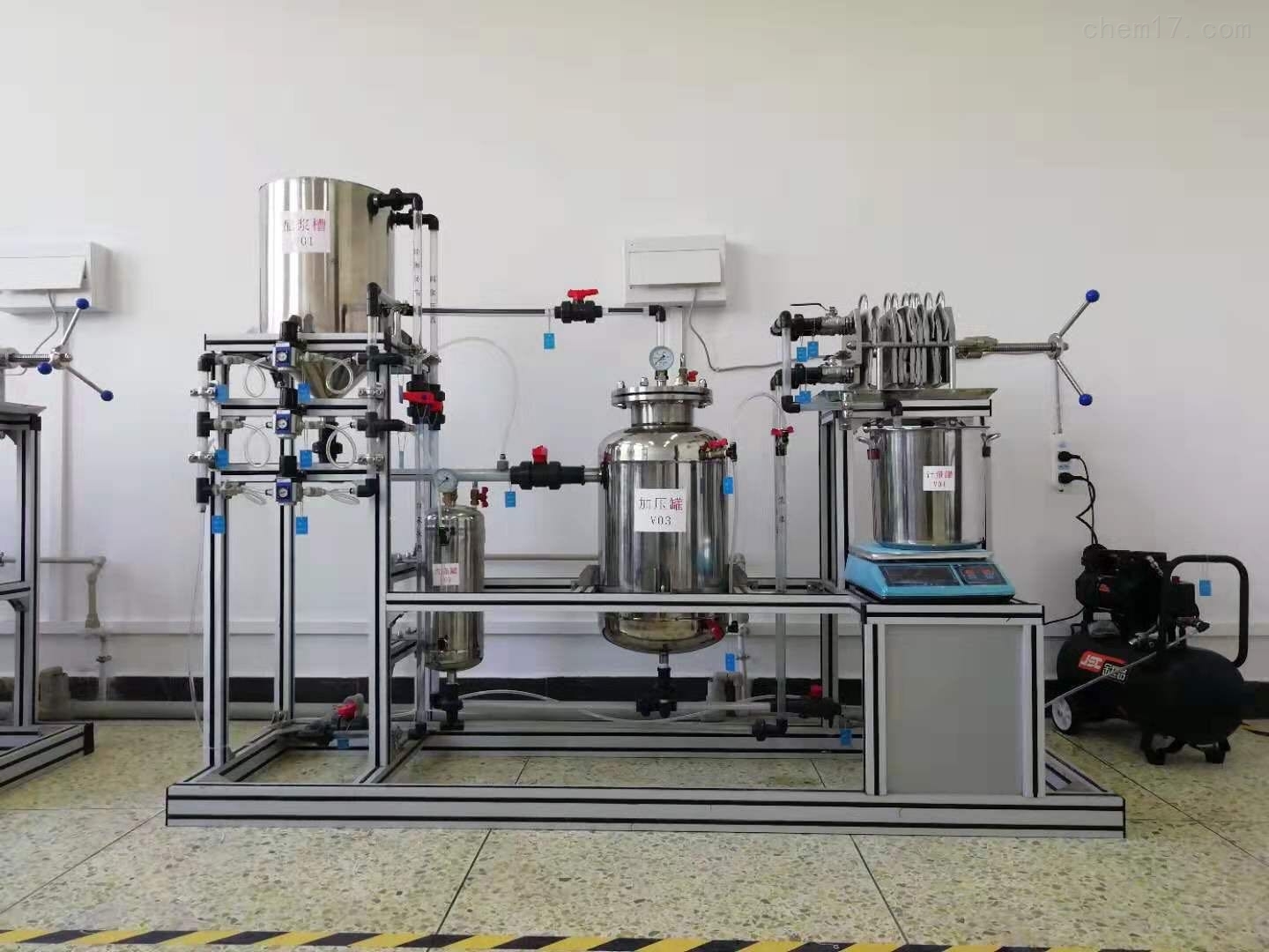 4、该实验装置是由过滤板、过滤框组成的小型工业用不锈钢板框过滤机,能完整地体现了板框压滤机的构造和操作流程,采用无噪音压缩机,采用气动配料、气动搅拌加压技术,操作简单。