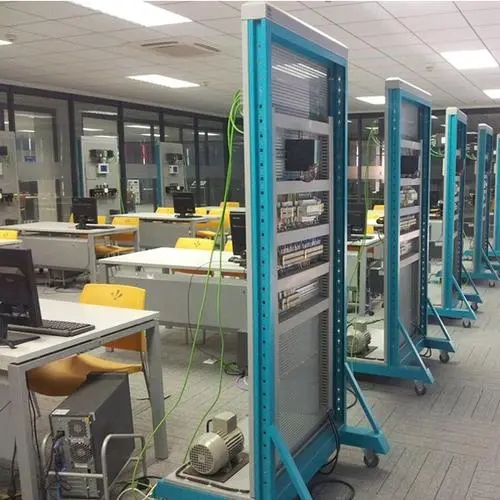 钢材框架与网控板均采用双层亚光密纹喷塑结构,网孔板上可以根据任务要求调整上面安装的设备,自动化设备包括PLC、人机界面、变频器、工业交换机、导轨式开关电源等目前工业控制系统上最常用的设备,完成电气控制线路的连接。