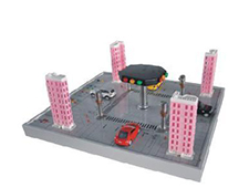 本企业设计开发的模型为实际十字路口现况按比例微缩而成,主要由仿真实物建筑模型、车辆实物模型、道路模型及交通指挥灯等部件组成。有电源指示和控制、启/停按钮、手/自动按钮、行人呼叫按钮、四方向红/黄/绿灯点阵指示??椋ň哂卸髂媳笔较蛳允荆⑺姆较蚴氲辜剖毕允灸??,车辆行进声光指示(不同方向的车行进时可用不同的声音及指示灯进行指示)等??刂破鞑捎?;三菱主机为FX1N-24MR 内置开关量I/O(14路开关量输入/10路数字量输出)+FX2N-8EYR(8路数字量输出)。选用的主机功能齐全,性能优越。实训操作灵活方便,能满足大中专院校、职业技术学校、职教中心可编程控制器技术的教学、课程设计和毕业设计。