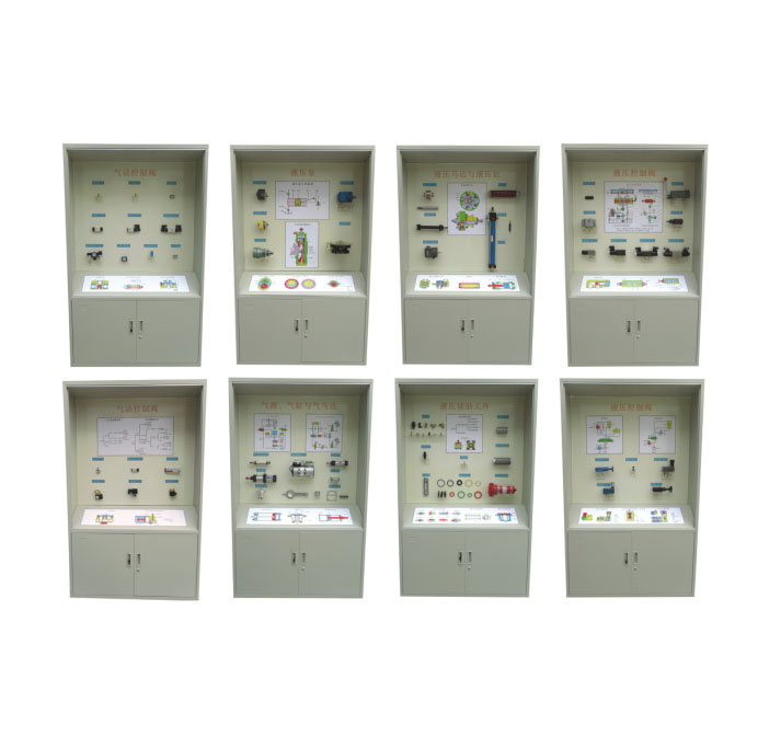 气动液压示教陈列柜是为了满足大、中院校的教学需要,根据相关教材编制设计的现代教学设备,其中主要以实物或模型以及必要的图文资料展示气缸,控制阀,液压泵,马达,控制阀等相关元件的基本类型与基本结构。
