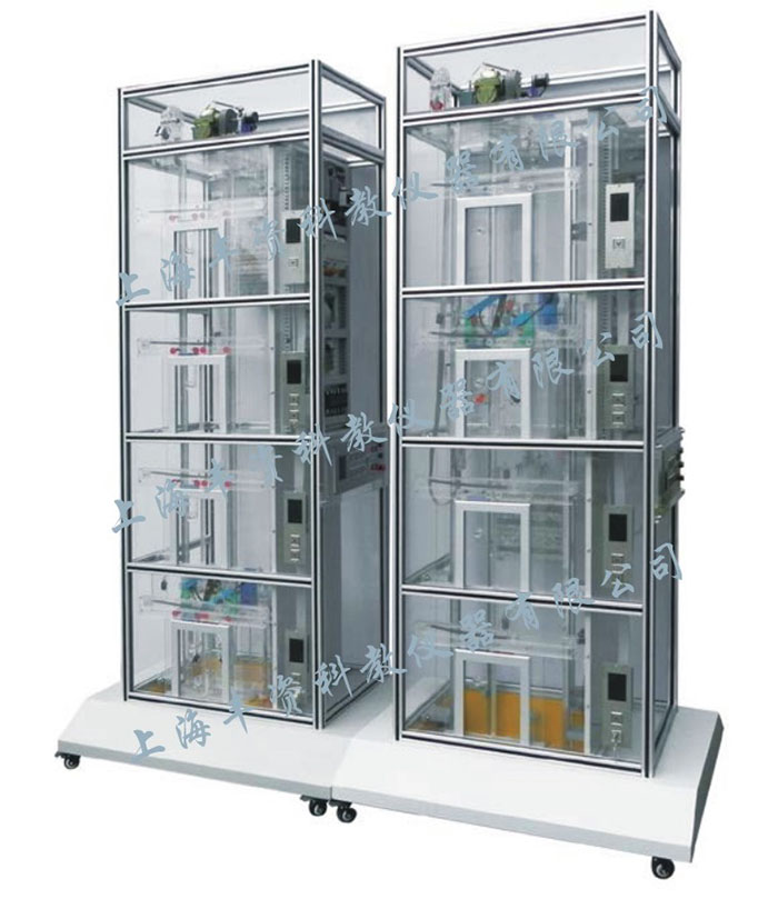 1、由两台四层透明仿真教学客梯组成,由层外两处按钮共同控制。
