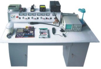 (四)实训桌: 整体结构采用钢木落地台式 ,利于实验室布局。桌面为防水、防火、耐麿高密度板、结构坚固,造型美观大方。设有抽屉和柜门,用于放置工具和资料等。
