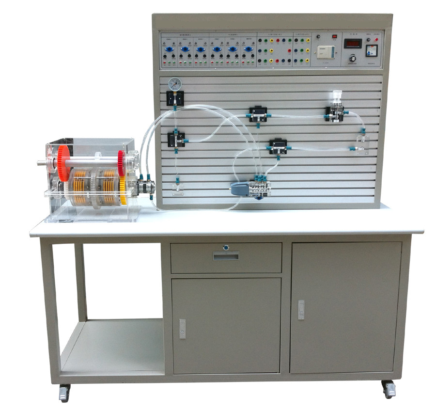 透明湿式离合器变速箱与液压元件外壳采用透明有机玻璃加工而成,油路采用防漏透明油管,能清晰直观的观察到元件内部结构和液压流动过程。真实演示湿式离合器变速箱摩擦片分离、结合、换挡、变速动作。可开设液压传动演示、两种控制方式PLC控制与继电器控制的基本回路。适合大中专院?;缋嘧ㄒ?ldquo;液压传动”、“液压与气压传动”等课程的教学实验需要。
