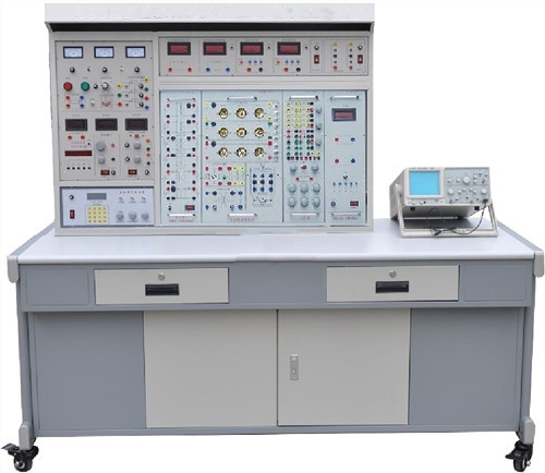 实验桌为铁质双层亚光密纹喷塑结构,桌面为防火、防水、耐磨高密度板;左右设有两个大抽屉(带锁),用于放置工具及资料。右边设有放置示波器用的可拆卸搁板。