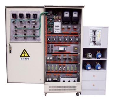 该装置按标准电气控制柜设计制造规格,充分利用双面位置,柜内装有完成各种照明电路所需的单相电度表、日光灯、单联开关、插座、感应开关、漏电开关等,以及电气控制所需要的多种低压电器,如漏电断路器、熔断器、电流互感器、交流接触器、时间继电器、热继电器、中间继电器、行程开关、按钮、信号灯、转换开关、电压表、电流表、功率表及电度表等,为了延长电器使用寿命,各电器的接点都与接线端子相连,再由接线端子与被控制电气连接。