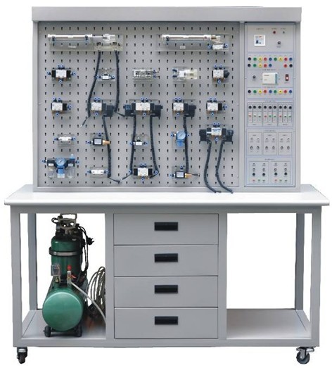 2、气动元件配备:空气压缩机、空气过滤、减压、油雾器三联件,减压阀,手动换向阀,电磁换向阀,气控换向阀,节流阀,单向节流阀,快速排气阀,或门型梭阀,单作用气缸,双作用气缸,旋转气缸等。