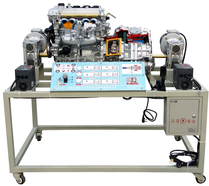该设备采用翻新丰田普锐斯混联式混合动力系统(包括:发动机、发电机和电动机等)总成进行剖面处理,各部件齐全,剖面位置合理,能全面展示混联式混合动力系统内外部结构和部件的运动情况。适用于混合动力汽车动力系统原理和机械机构的教学。