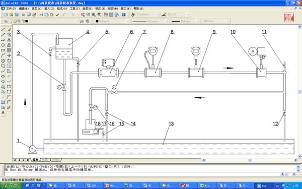 7.比例调节阀; 8. 涡街流量计; 9. 涡轮流量计; 10. 孔板流量计; 11. 放气阀; 13. 水槽;