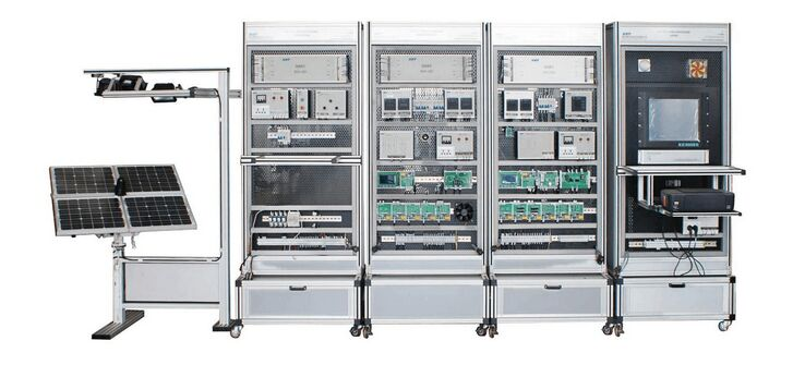 设备由光源模拟跟踪装置、光源模拟跟踪控制系统、能量转换控制存储系统、离网逆变负载系统、监控系统五个部分组成,各功能部分通过通讯电缆和连接电缆进行连接,形成一套能够展示并动手设计、安装、调试的太阳能光伏发电工厂应用的设备。