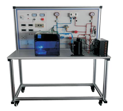 6、抽真空、充氮、检漏:通过真空泵、充氮装置、可进行系统抽真空,充氮试压的实际操作,学员使用检漏工具查出系统中的泄漏点。